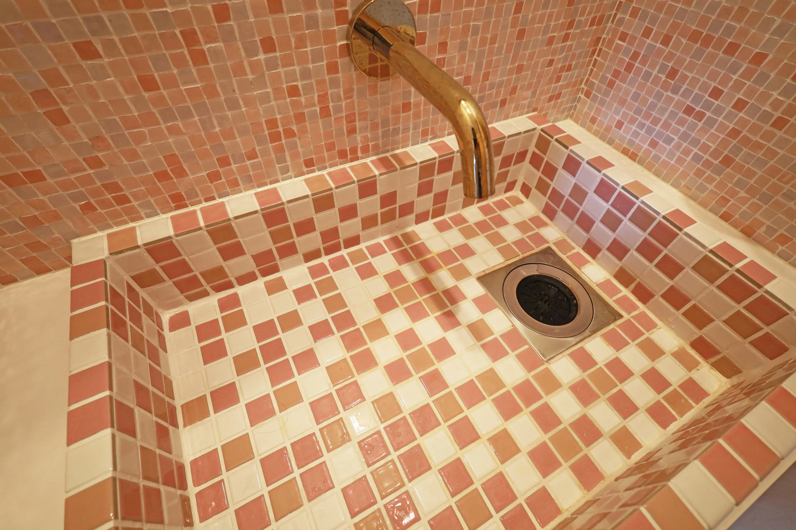 洗面のタイルと壁のタイルの色味を合わせて