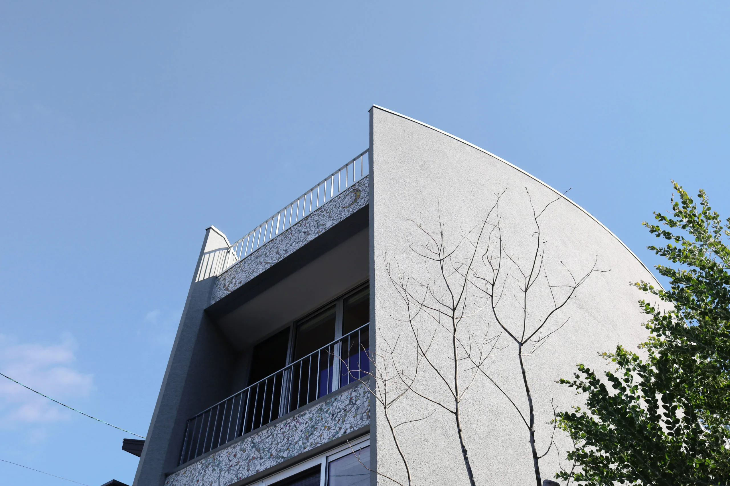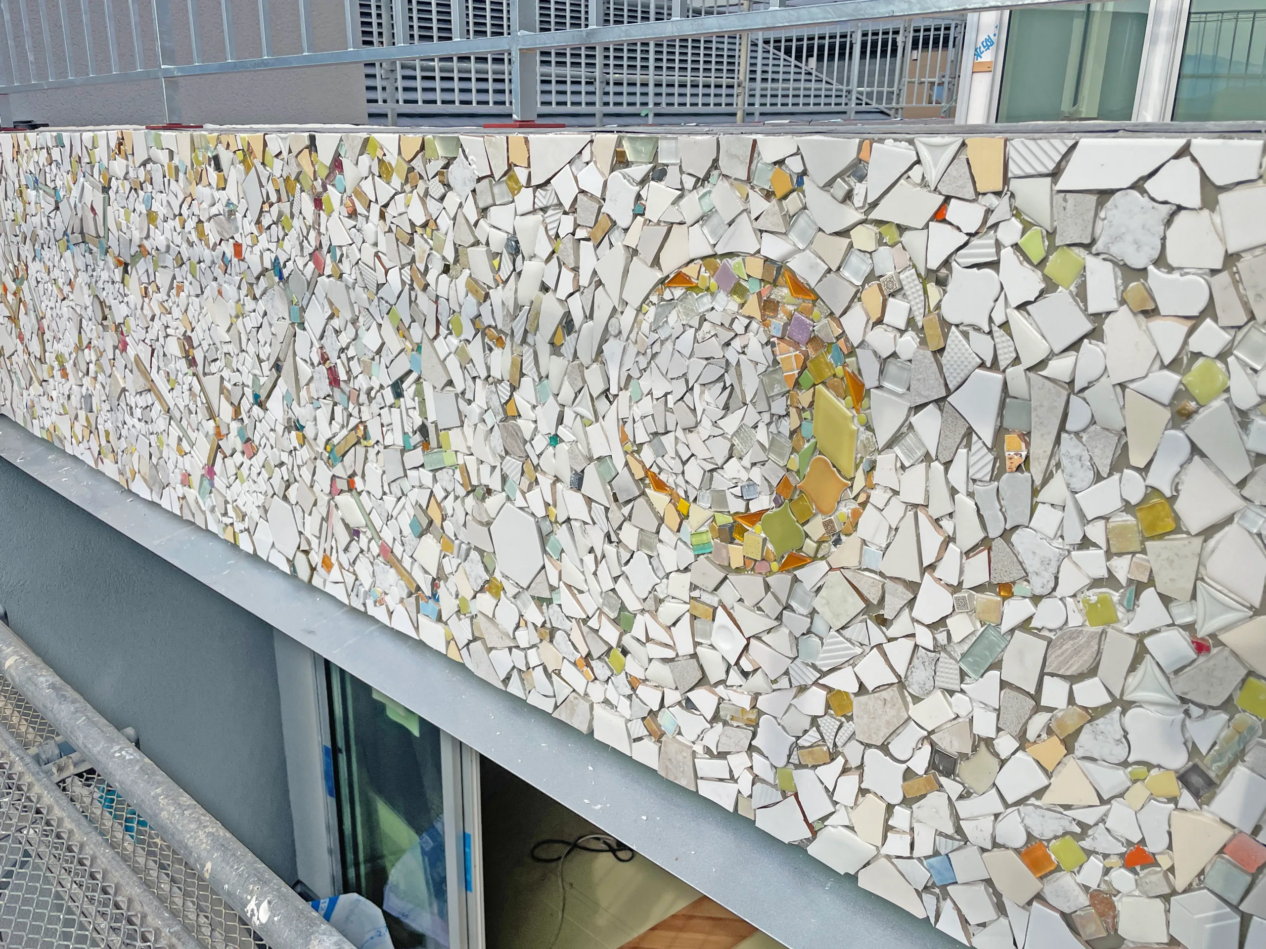外壁のモザイクタイルに太陽の光が反射して